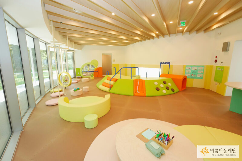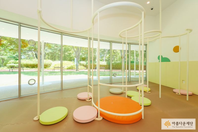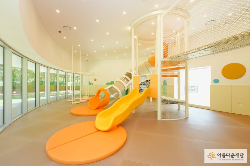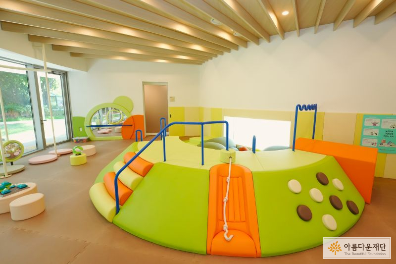 무장애 놀이터는 장애아동뿐 아니라 모든 어린이와 보호자가 함께 이용할 수 있는 공간입니다. 통합놀이터나 무장애놀이터라는 말 때문에 장애 가족만을 위한 공간으로 생각할 수도 있지만, 사실은 연령과 신체조건, 발달 단계가 다양한 아이들이 자연스럽게 어울리고 서로를 이해할 수 있도록 설계된 놀이터입니다. 아름다운재단은 놀이터에는 문턱도, 마음의 장벽도 없어야 한다는 믿음으로 누구나 자유롭게 뛰놀 수 있도록 무장애 실내 놀이터를 조성했습니다. 이 안전하고 즐거운 공간에서 쑥쑥 자랄 어린이들을 기다리겠습니다.