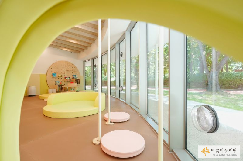 코지라운지는 안락하고 숨은 공간을 좋아하는 친구들을 위한 작은 아지트 공간입니다. 확 트인 창을 내어 공원을 바라볼 수 있도록 했습니다. 영유아나 발달장애 아동도, 보조기구를 사용하는 양육자도, 서로 관찰하고 의사소통이 가능하도록 터널 통로 외에 오픈된 통로도 함께 만들어 두었습니다. 누구나 안심하고 신체 놀이를 즐길 수 있습니다.
