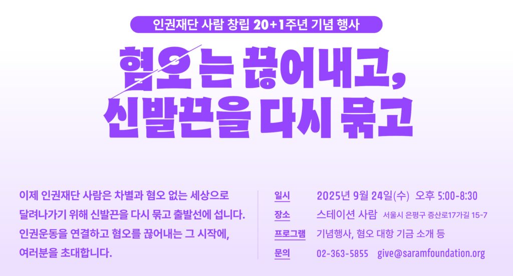 A. 인권재단 사람은 9월 ‘혐오 대항 기금’ 조성을 시작해요. 여성과 이주민, 성소수자, 장애인 등을 모욕하고 공격하는 말들, 혐오표현이 점점 심각해지고 있는데요. 혐오표현은 개인이 별 뜻 없이 하는 말이 아니라 정치인이 뱉어내고 거대 온라인 플랫폼에서 확산되며, 일터나 학교에서의 차별과 폭력으로 이어지고 있습니다. 요즘처럼 유튜브 알고리즘과 AI가 일상생활 깊숙이 자리 잡고 있는 상황에서 더이상 지나쳐버릴 수 없는 문제예요. 조성된 기금으로 내년부터 혐오표현에 대항하는 시민들의 힘을 키우는 인권활동을 지원할 예정입니다. 이 새로운 도전에 함께해 줄 구독자분들을 기다립니다!