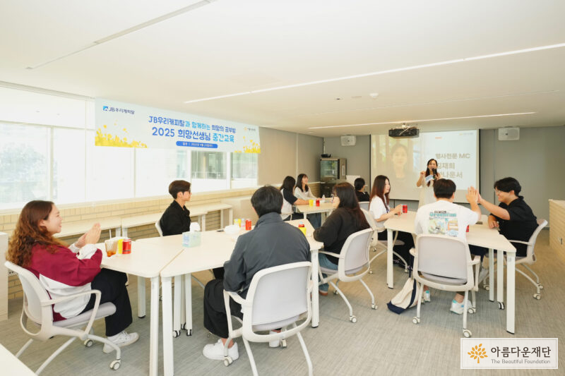 ‘2025 희망 선생님 중간교육’은 희망선생님의 성장을 북돋우는 자기 성찰의 자리이자, 서로의 경험을 통해 배우는 연대의 시간이었습니다. 아름다운재단과 JB우리캐피탈은 앞으로도 청년과 아이들이 함께 배우고 성장할 수 있도록 든든한 지지망이 되려 합니다.