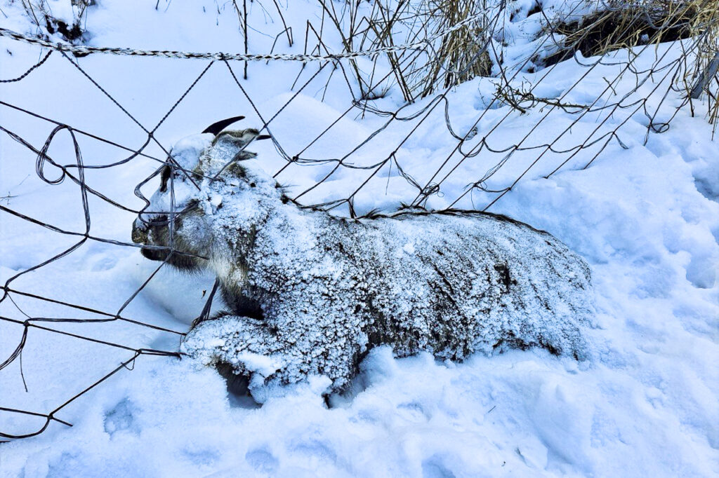 쉽게 생각하면 이렇다. 물고기 개체 감소 원인 중 하나로 저인망 그물이 꼽히곤 한다. 배 두척이 나란히 그물을 매달고 가면서 바닥까지 긁어서 물고기를 잡는 방식이다. 치어들까지 잡히는 방식이라 엄격히 규제하고 있다. 저인망 그물을 산으로 올려보면 아마 ASF차단 울타리와 비슷하지 않을까. 물샐틈없이 설치한 ASF울타리는 폭설에 갇힌 산양을 이중으로 가뒀고, 저체온증에 먹이까지 구하지 못한 스트레스로 인해 떼죽음에 이르렀다. 위가 네 개라 되새김질을 하며 오래 버틸 수 있는데도 아사, 탈진으로 사망한 개체가 가장 많다는 것이 이를 증명한다.