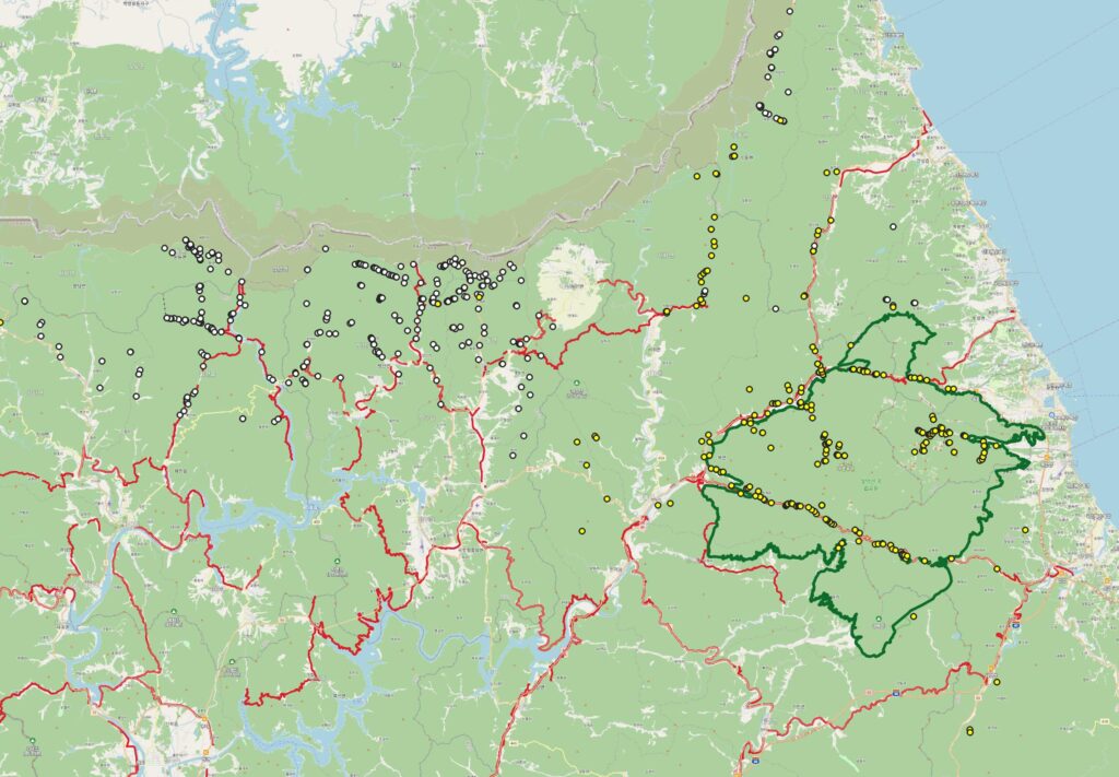 “울타리 설치가 시작된 건 2019년이고, 2020년부터 급작스럽게 산양 폐사율이 높아지기 시작합니다. 하지만 인과관계를 누구도 인지하지 못했어요. 지도에 폐사 위치를 점을 찍어가며 살펴보니 윤곽이 나오더라고요. 산양 50% 정도가 화천, 양구에서, 30% 정도가 설악산에서, 20% 정도가 울진 삼척에서 떼죽음을 당했는데 화천, 양구는 ASF 차단 울타리가 집중적으로 설치되어있는데다 군 철책이 있습니다. 산양이 이동하지 못하고 고립되면서 먹이 활동을 못하게 된 거죠. 다행히 산양 위가 4개라서 되새김질이 가능하다보니 눈 속에서도 오랜 시간 동안 버틸 수 있어요. 근데 생각 이상의 눈이 와버렸을 때는 산양도 대피로가 필요하잖아요. 그게 계곡이에요. 물이 흐르기 때문에 생각보다 온도가 눈이 금방 녹거든요. 그렇게 계속 내려가다가 돌아가려고 보면 울타리에 가로막혀서 갈 수가 없는 거죠.”
