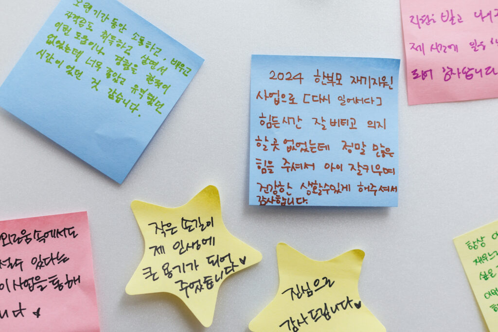 24년 성과공유회에서 한부모여성이 남긴 포스트잇에는 다시 일어서고자 하는 마음들이 담겨 있다.