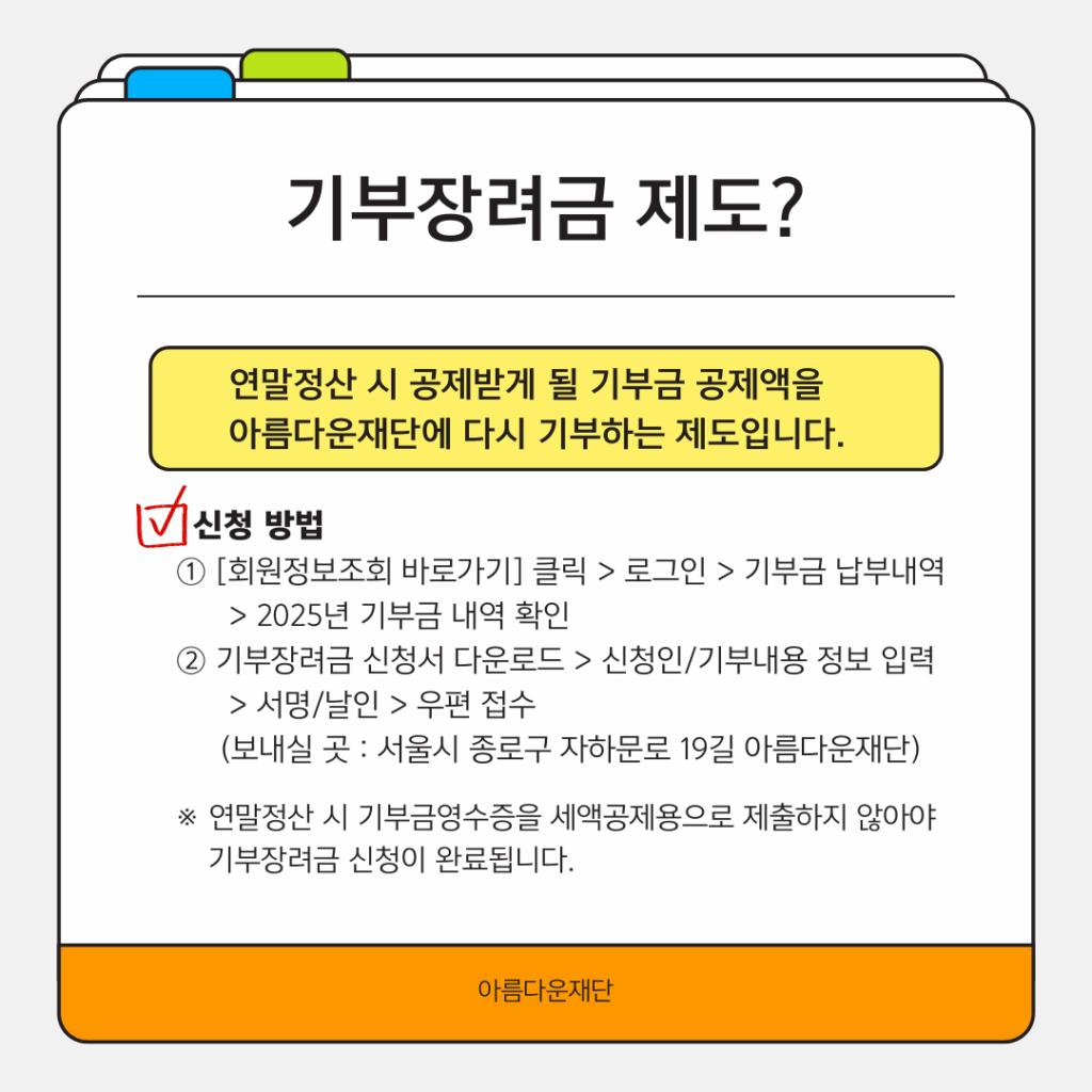 [공지] 2025년 기부금영수증 발급 안내 2025.12.22 링크가 복사되었습니다. [아름다운재단]기부장려금신청서_신청인명,신청일시다운로드 #전자기부금영수증 #손금산입 #세제혜택 #연말정산 #기부금영수증 #기부금 #나눔 #세액공제