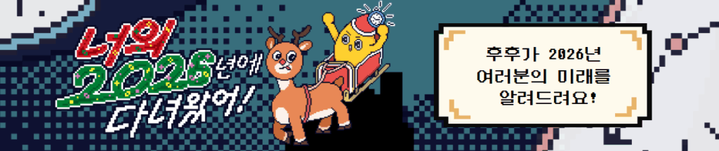 2025년을 돌아보고, 2026년으로 나아갈 용기를 채울 수 있는 프로모션 ‘너의 2026년에 다녀왔어’다. 아직 참여해보지 않았다면? 위 배너를 클릭하면 된다. 후후레터의 마스코트, 후후가 직접 미래에 다녀와 2026년이 어떻게 될지 알려주는 간단한 내용의 프로모션이다. 후후에게 2025년이 어땠는지 들려주면, 미래를 알려준다. 설계법은 쉿, 비밀이다.