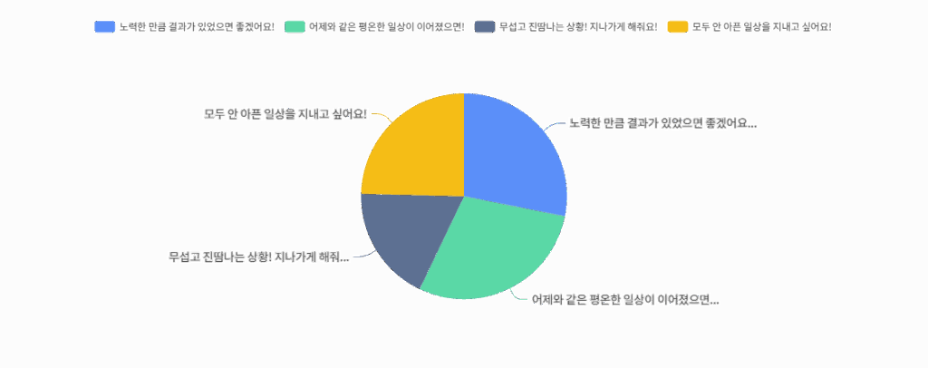 한 해를 회고해볼 수 있는 첫 번째 질문에는 ‘몸과 마음 모두 힘든 일이 많아서 버거웠다(33.1%)’는 응답이 가장 많았다. 결과를 살펴보며 어려운 일들을 겪은 모두에게 2026년이 새 살이 돋아나는 한 해가 되기를 마음으로 진심으로 바라고 있다. 다음으로는 ‘그럭저럭 무탈하게 지냈다(29.1%)’, ‘마음을 줄 수 있는 존재들을 만나 행복했다(20.8%)’, ‘올해 세운 목표를 이뤄가며 성장했다(17.6%)’는 응답이 뒤를 이었다.
