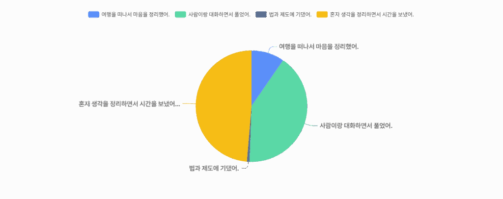 지난 1년 간 쓴 다이어리를 뒤적이다보니 끝나지 않을 것 같던 괴로운 순간도 결국은 다 지나갔다는 것을 느낄 수 있었다. 물론 저절로 나아지는 법은 없다. 자신만의 방법이 있다. ‘혼자 생각을 정리하면서 시간을 보냈다(48.6%)’는 사람들이 가장 많았다. ‘사람들이랑 대화하면서 풀었다(40.9%)’, ‘여행을 떠나서 마음을 정리했다(9.6%)’, ‘법과 제도에 기댔다(0.7%)’는 응답이 뒤를 이었다.