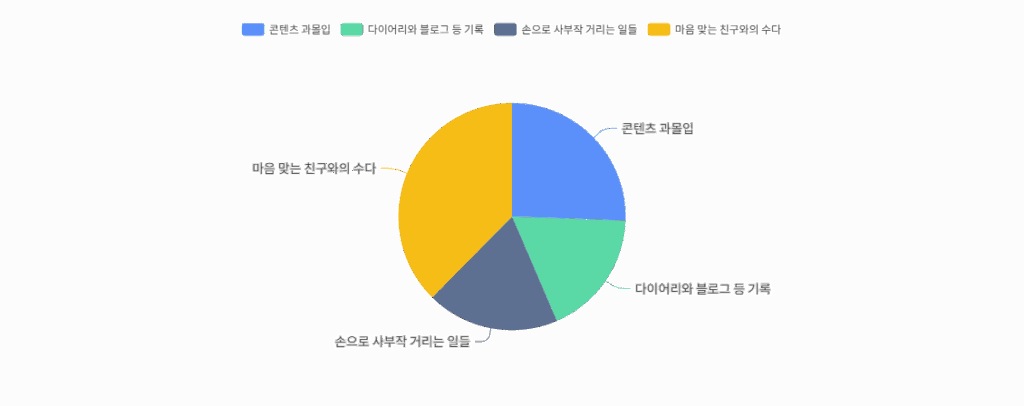 마지막 질문! 가끔 아무것도 하기 싫을만큼 무기력해질 때 사람들은 어떻게 기운을 충전했을지 궁금했다. 1위는 바로 ‘마음맞는 친구와의 수다(37.6%)’였다. 터놓고 실컷 이야기하고, 맞장구치면서 울고 웃다보면 마음이 뻥 뚫리곤 하지. 2위는 OTT의 시대답게 ‘콘텐츠 과몰입(25.5%)’이 차지했다. ‘손으로 사부작 거리는 일들(18.8%)’, ‘다이어리와 블로그 등 기록(17.9%)’은 그 뒤를 이었다.