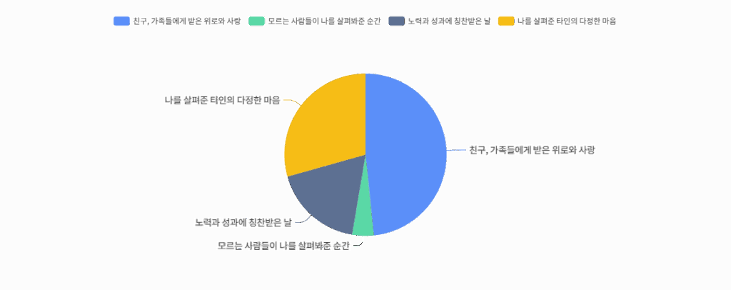 좋은 기억 하나로 나쁜 일들 몇 개를 헤쳐나가야 하는 것이 삶이다. 슬픔의 방패막이 되어줄 순간은 무엇일지 궁금했다. 예상대로 ‘친구, 가족들에게 받은 위로와 사랑(48.3%)’이 가장 많은 비중을 차지했다. ‘나를 살펴준 타인의 마음(29.3%)’, ‘노력과 성과에 칭찬받은 날(17.9%)’, ‘모르는 사람들이 나를 살펴봐준 순간(4.3%)’이 뒤를 이었다.