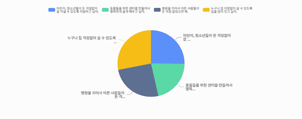 뉴스를 보면 갑자기 능력이 생겨서 척척 해결해버리고 싶은 사건들이 보인다. 사람들에게도 그런 일들이 한 두개는 있을 것 같다고 생각했다. 능력이 생기면 해결하고 싶은 일 1위, ‘누구나 집 걱정없이 살 수 있도록 집을 많이 짓고 싶다(28%)’였다. 누구나 하루 끝에 머물고 싶은 ‘집’이 필요하다는 것에는 이견이 없을 것이다. ‘병원을 지어서 아픈 사람들이 돈 걱정 없었으면 해(25.4%)’, ‘어린이, 청소년들이 돈 걱정없이 잘 지낼 수 있도록 지원하고 싶어(25.1%)’, ‘동물들을 위한 센터를 만들어서 행복하게 살게 해주고 싶어(21.2%)’가 뒤를 이었다.