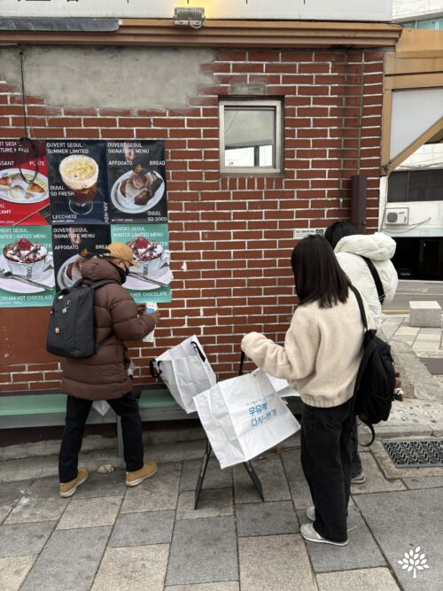 다같이 지소행 가방을 들고 걸어가본다. 문을 연 카페에는 다 같이 들어가는 줄 알았는데 한 사람만 들어가서 종이팩을 받아온다. 영업에 지장을 주지 않기 위해서 조용히 들어가 받아오는 배려였다.