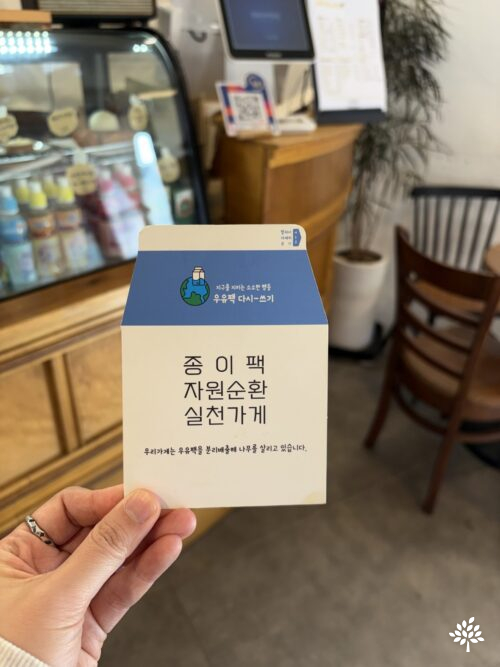 카페를 모두 돌고 나니 종이팩 168개가 모였다. 이렇게 모은 종이팩을 들고 근처 거점공간으로 향했다. 월수금 동안 모은 종이팩을 여기에 둘 수 있도록 배려해준 곳이다. 어느정도 종이팩이 쌓이면 지소행에서 재활용처로 보내고, 재활용처가 별도 공정을 거친 이후 제지회사로 보내면 재생휴지 등으로 재탄생하게 된다.