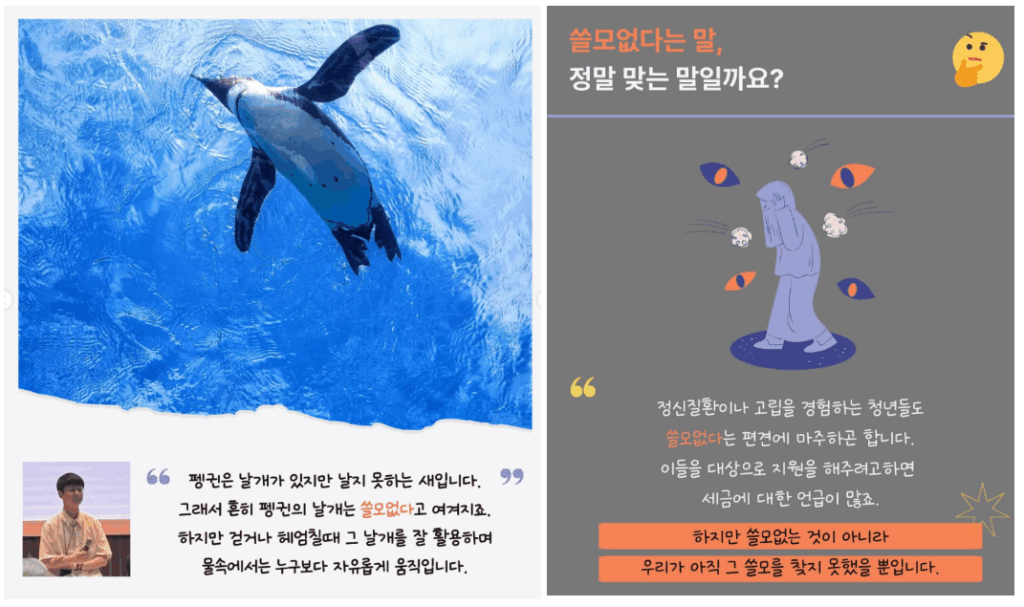 수은: 저는 ‘펭귄의 날갯짓’ 이광호 활동가님. 펭귄의 날갯짓은 정신 질환을 갖고 있는 분들이나 고립은둔청년을 지원하는 단체인데요. 여기 와서 이런 단체가 있는지 처음 알게 됐어요. 어떻게 보면 저도 당사자성을 갖고 있기 때문에 이 단체의 활동이 되게 인상 깊었어요. 본인 소개하실 때부터 나는 이런 정신질환을 갖고 있고, 그래서 이런 활동들을 하고 있다고 하셨거든요.