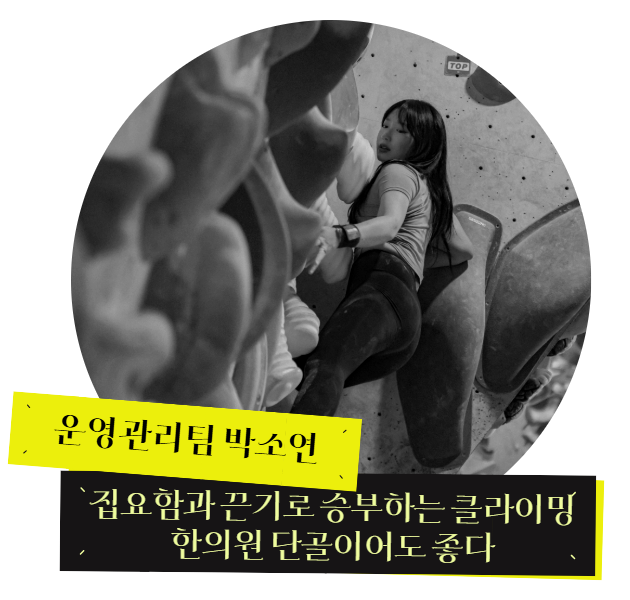 지금 즐기고 있는 운동종목은? 클라이밍. 그 중에서도 볼더링이라는 암벽타기 종목이다. 같은 색상의 홀드를 잡고 이동하는데 홀드 간 간격이 떨어져있는 등 코스마다 변주가 있어서 실제 암벽을 타면서 어떻게 이동할지 연구도 한다. 운동 횟수는? 주 2~3회 언제 시작? 2022년 3월, 입사 후 바로! 운동하면서 스스로 체크하거나 살피는 수치가 있다면? 클라이밍 난이도(색깔) 추이 기록과 함께 근육량을 살핀다. 운동하려고 이것까지 해봤다? 같은 색상의 홀드를 밟아 탑까지 올라가는 것을 한 문제로 본다. 잘 안풀려서 2주 동안 3번에 걸쳐 방문해 끝끝내 풀었던 적이 있다. 한 문제를 매번 3시간씩 걸리는 걸 생각하면 나름 집요한 편! 열심히 하다보니 근육통이 있기도 해서 한의원 단골이 되기도 했을 정도. 지금까지 운동을 유지하고 있는 이유? 일단 재밌다. 인생 처음으로 꾸준히 운동해본다. 친구들과 만나서 같이 운동하는데 건강하게 시간을 보내는 것 같아 좋다. 무엇보다 스스로 기록을 만들면서 성취감과 자존감도 올라갔다. 운동하면서 스스로 느끼는 가장 큰 변화는? ‘실패해도 괜찮아! 일단 해보자’라는 마인드가 강해졌다. 몇 번을 실패해도 계속 도전하면 되니까! 기존 방법으로 풀리지 않으면 다른 방법으로 풀려고 고민하는데 이런 태도들이 업무할 때도 이어지는 것 같다. 해당 종목만의 매력이 있다면? 클라이밍은 버디(2명이 함께푸는 문제)를 통해 서로 힘을 합치고, 모르는 사람에게도 나이스를 외쳐주는 공동체 정신이 빛나는 운동 문화다. 날씨와 상관없이 즐길 수 있는 점도 매력적이다.