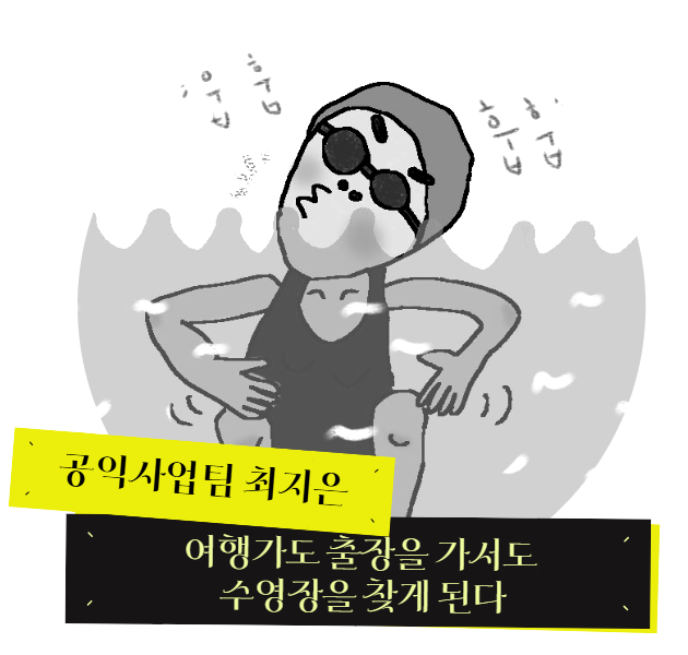 즐기고 있는 운동 종목은? 수영 운동하면서 스스로 느끼는 가장 큰 변화는? ‘귀찮은 일도 계속하다 보면 안 귀찮아진다’는 걸 정말 ‘몸소’ 배웠달까? 수영을 하기 전에는 짐을 챙기고, 옷을 벗고, 수영복을 입고, 또 나와서 씻고, 짐 챙기고 하는 일련의 과정들을 상상만 해도 귀찮고 번잡스럽다고 생각했는데 막상 하다 보면 진짜 별거 아니라는 걸 알 수 있었다. 귀찮은 일들을 극복하면서, 어려운 일들을 마주하는 데 마음가짐이 좀 더 가벼워졌다. 운동하면서 목격한 변화가 있다면? 희망하는 변화를 말해보고 싶다. 아직까진 수영장이 모두에게 열려있는 공간은 아니라고 생각한다. 신체적 이유로, 혹은 연령, 지역, 경제적 조건 때문에 수영을 할 수 없는 경우가 많다. 그런 차원에서 모두가 이용할 수 있는 공공 수영장이 더더더더! 많아졌으면 한다. |