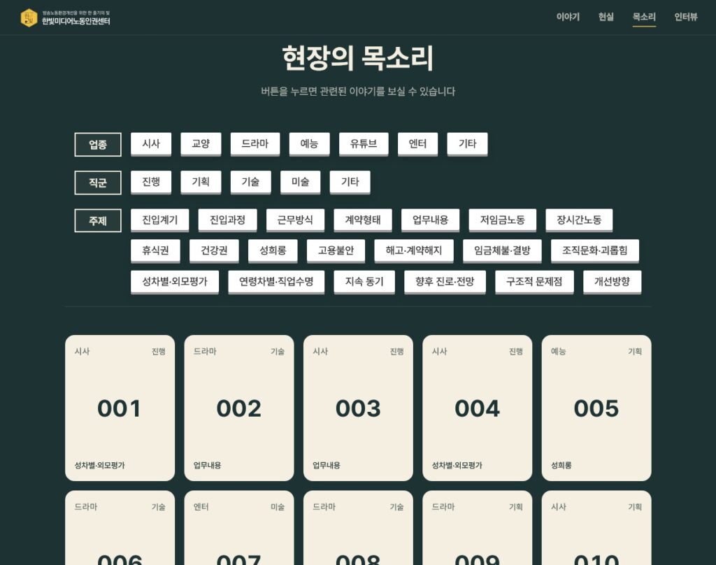 자신들의 치부이기도 하다는 이유로, 방송은 원래 그렇다는 이유로, 좋아서 하는 일이라는 이유로, 이런 여러 가지 이유로 화면 너머의 노동의 이야기는 좀처럼 드러나지 않습니다. 그래서 이번에는 한빛센터에서는 방송 노동 현장의 목소리를 누구나 손쉽게 볼 수 있도록 웹인터렉티브 페이지 제작을 기획하였습니다.