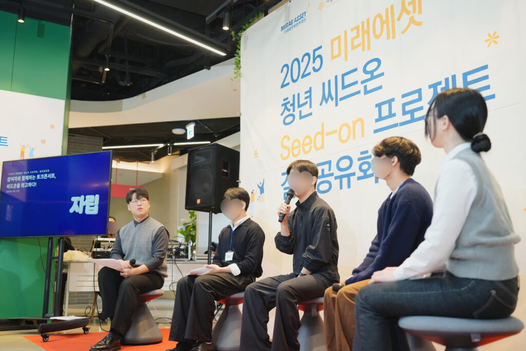 결과공유회의 하이라이트는 미래에셋 청년 씨드온(Seed-on) 프로젝트에 참여한 청년들과 함께하는 ‘토크콘서트’였습니다. 조현수 대표의 사회로 이어진 자리에서 청년들은 각자의 변화와 앞으로의 계획을 솔직하게 나눴습니다.