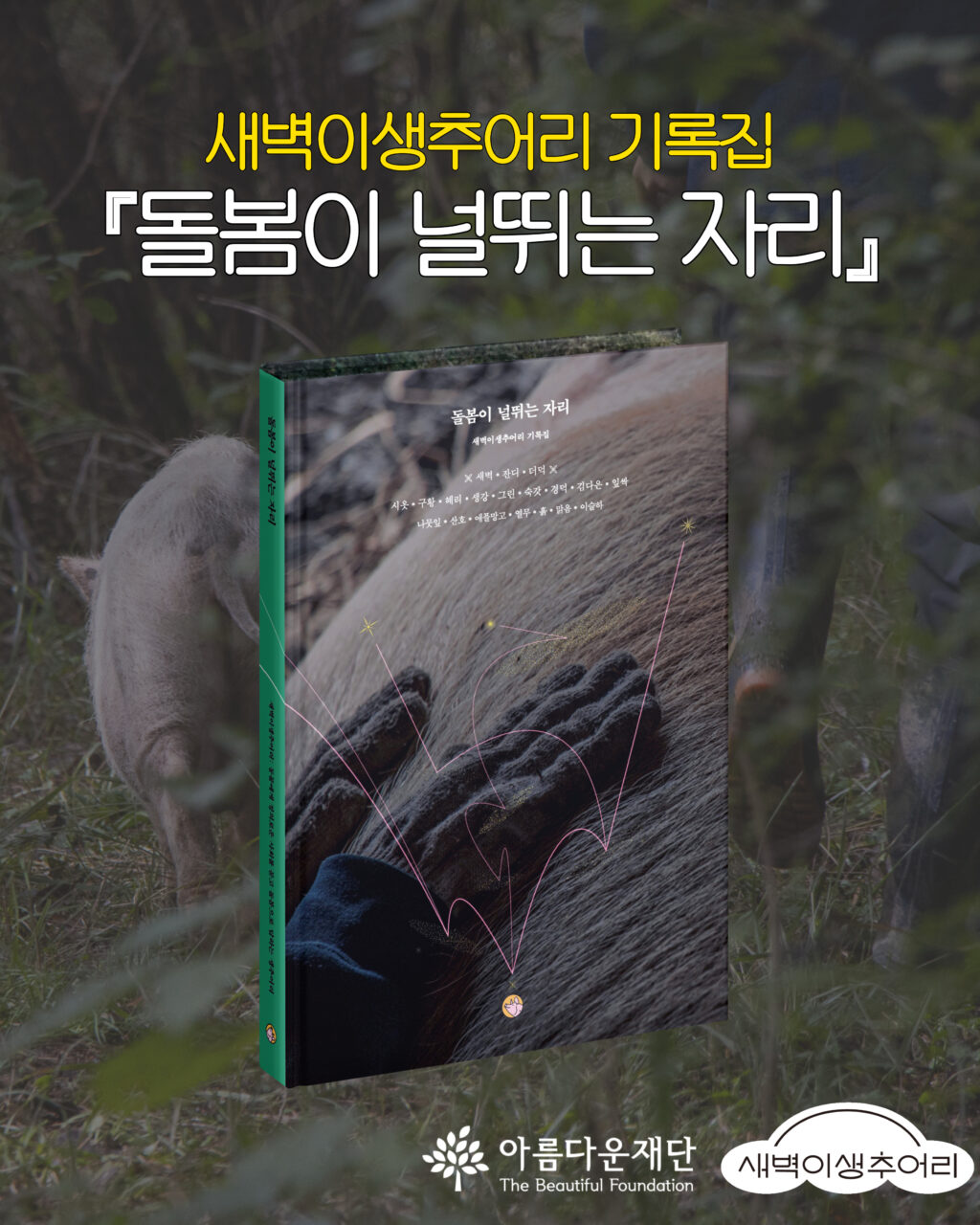 새벽이생추어리의 첫 기록집 ‘돌봄이 널뛰는 자리’가 아름다운재단 ‘2025 공익콘텐츠 제작 지원사업’을 통해 세상에 나오게 되었습니다. 국내 첫 동물 생추어리인 새벽이생추어리는 구조된 동물들이 자신답게 살아갈 수 있는 사회를 만들기 위해 활동하고 있습니다. 2020년 4월에 설립된 국내 첫 번째 생추어리입니다. 국내 최초로 공장식 축산업 돈사에서 공개구조(Open Rescue)된 돼지 ‘새벽’과 의약회사 실험동물이었던 돼지 ‘잔디’, 이후 도로에서 구조된 오리 ‘더덕’과 닭 ‘뿌리’가 삶을 회복하며 자신답게 살아가는 사회를 위해 활동하는 동물권 단체입니다.