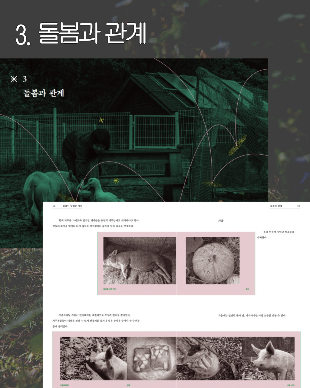생추어리에서 일어나는 매일의 돌봄에서 거주민과 어떻게 관계 맺는지 다룹니다. 새벽과 잔디에게 적절한 식단을 꾸리는 방법, 계절에 따라 필요한 돌봄들, 유박비료를 먹고 크게 앓았던 잔디와 그의 곁을 지킨 활동가들, 거주민과의 첫 만남, 그리고 2022년부터 2025년까지 매일 써 내려간 실제 돌봄일지가 일부 실려있습니다.