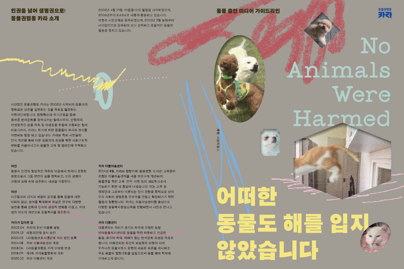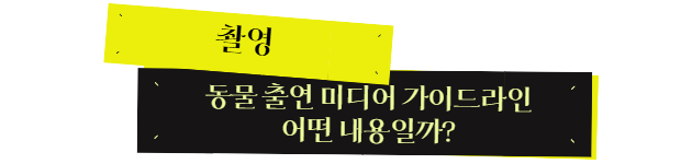동물권행동 카라는 국내 최초로 영화, 방송, 다큐멘터리, 1인 미디어 등 모든 영상물에 적용할 수 있는 ‘미디어 동물 출연 가이드라인(2020년)’을 제작해 배포했습니다. 동물 보호뿐만 아니라 현장의 촬영진을 보호하기 위한 조치도 함께 기재되어 있어요. 그중 몇 가지 이야기들을 소개해 드립니다. 자세한 내용은 동물출연 미디어 가이드라인(링크)을 참고하세요! |