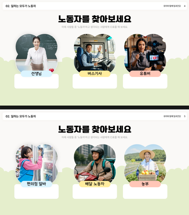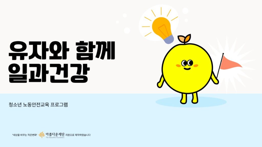 ‘유자와 함께 일과건강’은 어린이 청소년들이 내 옆의 노동자가 어떤 위험을 안고 일하고 있는지 이야기하며, 일터에서 나 자신을 지키는 방법, 그리고 안전하고 건강한 세상을 위해 우리가 함께 어떤 일을 할 수 있는지 일상적인 언어로 함께 만들어가는 교육 프로젝트입니다.