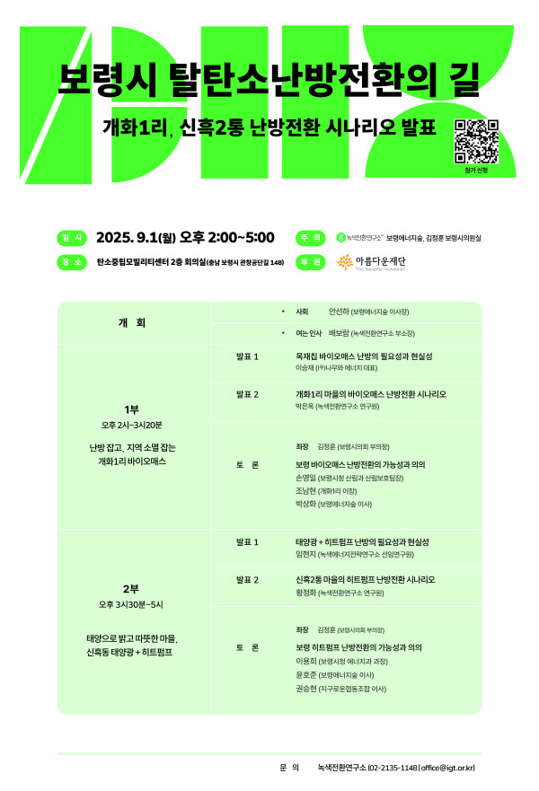 녹색전환연구소와 (구)보령시민에너지센터는 보령시의 지역적 특성과 주민의 삶을 중심에 두고, 난방열 분야에서의 탈탄소 전환 시나리오와 정책 로드맵을 함께 그려보고자 했습니다.
