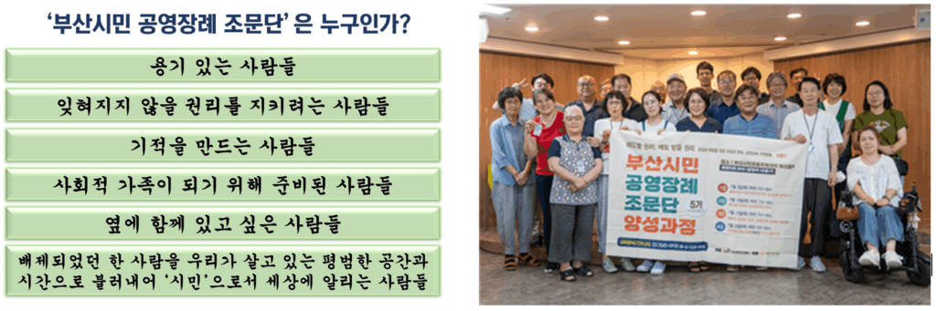 이번 프로젝트는 공영장례 조문단원들이 소중한 가치를 몸소 배우고, 시민들의 인식 변화를 경험할 수 있었던 시간이었습니다. ‘부산시민 공영장례 조문단’ 활동을 통해 삶과 죽음이 연결되는 문화가 우리 사회에 자리잡고, 존엄한 죽음과 애도의 권리가 모든 시민에게 보장되는 기본권으로 확장되기를 바랍니다.