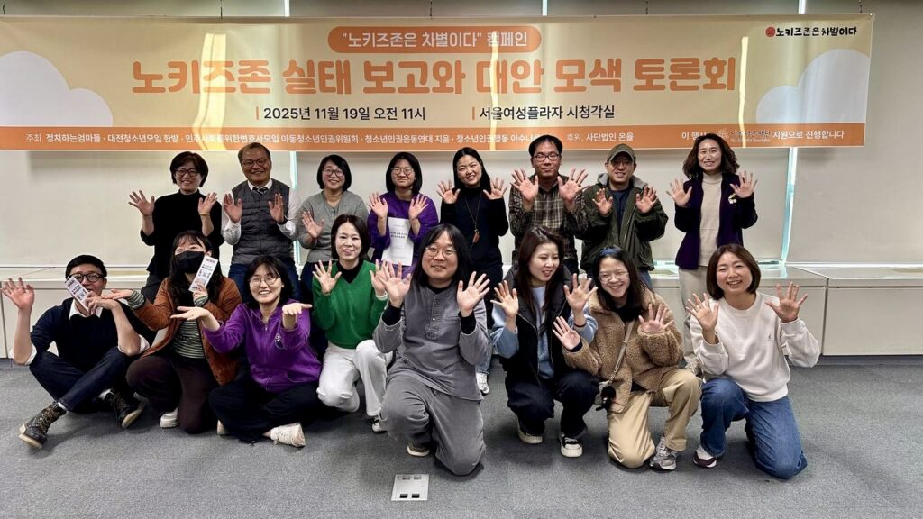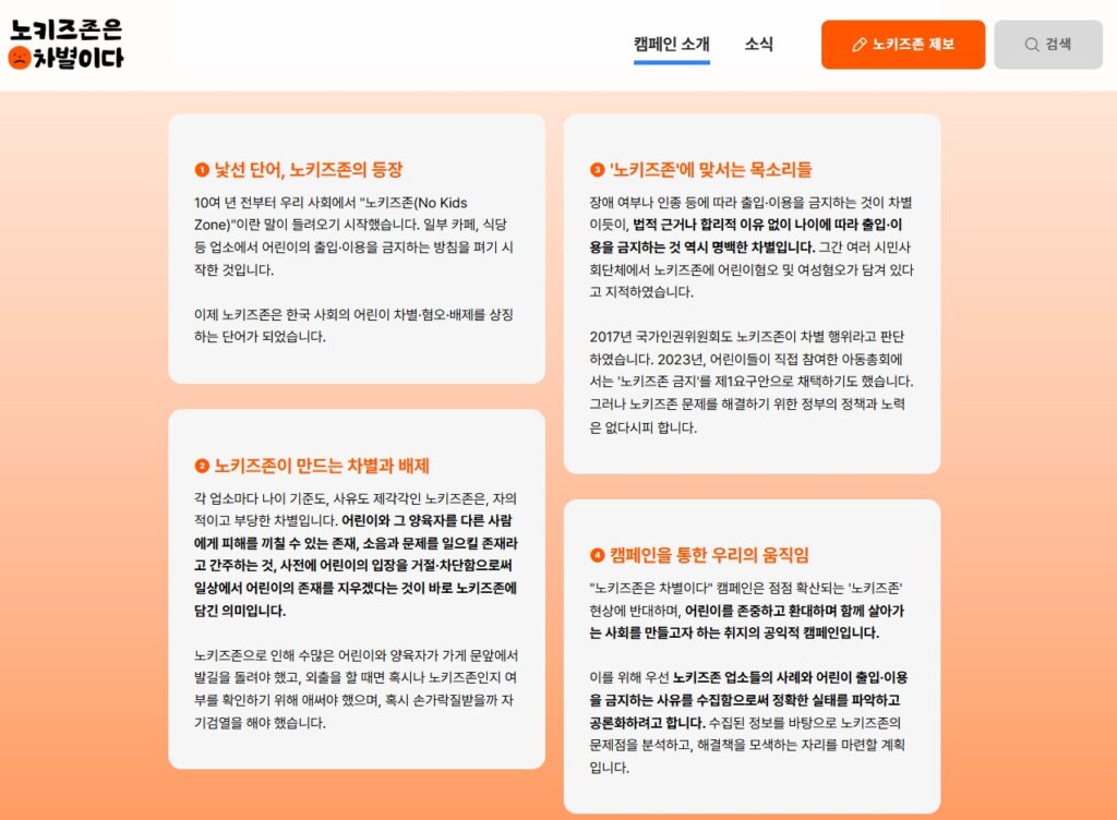 2025년 5월 2일 ‘어린이차별철폐의 날(5월 5일)’을 날을 앞두고 ‘세계 어린이 운동 발상지 기념비’ 앞에서 기자회견을 갖고, ‘노키즈존은 차별이다’ 캠페인의 출범을 알렸습니다. 주로 음료를 파는 까페에서 어린이를 차별하는 행태가 많다는 것에 착안해 텀블러에 붙일 수 있는 캠페인 스티커를 만들어 배포했습니다. 아름다운재단 지원을 받아 ‘노키즈존’의 연령 기준, 방침 이유 등 구체적인 실태를 모으고 보다 정교하게 사안을 파악할 수 있도록 캠페인 페이지를 만들고 ‘노키즈존’ 제보를 받기 시작했어요.