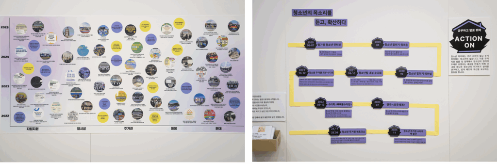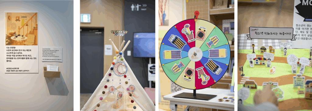 전시는 지난 3년의 활동을 바탕으로 “당신은 어떤 집에서 살고 싶나요?”라는 질문으로 시작되었습니다. 10명의 청소년이 이야기한 ‘집다운 집’은 모두 달랐고, 그 다름 자체가 존중받아야 할 삶의 모습임을 보여주었습니다. 전시 공간에는 온의 정책·연대 활동, 청소년 주거권과 탈시설을 다룬 캠페인 영상, 청소년의 집을 상징하는 텐트와 연대 단체들의 이름, 청소년 친화도시 모형이 함께 어우러지며, 청소년과 주거권이 자연스럽게 연결되는 사회를 그려냈습니다.