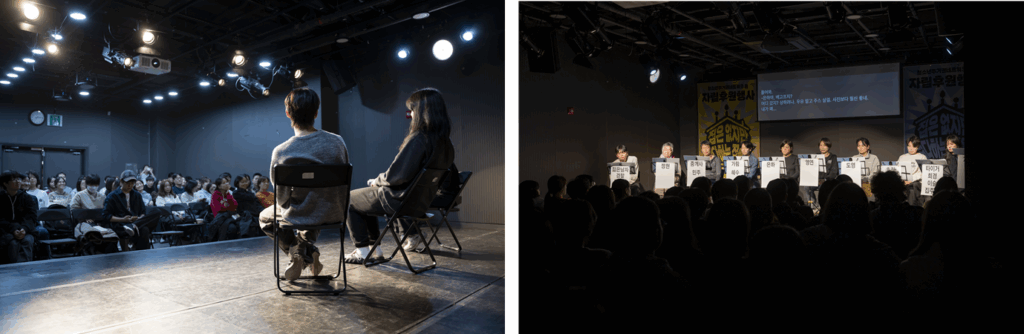 공연장에서는 낭독극 「내 숨이 내 발등에 닿을 때」가 상연되었습니다. 집이라 부르기 어려운 공간을 전전하는 청소년의 삶을 활동가들의 목소리로 담담하게 풀어낸 무대는 관객들에게 깊은 울림을 남겼습니다. 이어진 토크쇼에는 온의 청소년 주거지원 사업 ‘청소년주거119’에 참여 중인 두 명의 청소년이 무대에 올라, 쉼터와 그룹홈과 같은 시설을 거쳐 자신의 집을 꾸려가고 있는 현재의 삶을 나누었습니다. 이 이야기는 청소년에게 ‘집다운 집’이 가능해지기 위한 조건을 다시 생각하게 했습니다.
