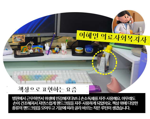 3️⃣일을 하면서 가장 힘이 되는 것이 있다면 무엇일까요? 환자나 보호자분들께 “덕분에 잘 치료받을 수 있었어요”라는 말을 들을 때 큰 힘이 됩니다. 무엇보다도 함께 일하는 팀장 수녀님과 동료들이 있어서 이 일을 오래 버틸 수 있는 것 같아요. 집에서 보내는 시간보다 병원에서 보내는 시간이 더 길다 보니 오랜 시간 함께하며 서로의 취향을 알고, 기쁨이나 때로는 분노까지도 함께 나눌 수 있는 비슷한 결의 사람들이라는 점에서 더 큰 힘이 됩니다. 혼자가 아니라는 감각이 이 일을 계속할 수 있게 만드는 가장 큰 힘입니다. (🔗인터뷰 더보기)