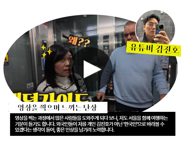 3️⃣여행 온 외국인들에게 도움을 주거나 말을 걸어보고 싶지만 언어 등의 문제로 가까이 가지 못하는 한국인들에게 한가지 꿀팁을 주신다면요? 길을 알려주는 정도에서는 언어가 크게 중요하지 않다고 생각합니다. 번역기가 있기 때문입니다! 꿀팁을 드리자면, 도움이 필요한 분들은 보통 주변을 계속 둘러보거나 핸드폰을 번갈아 보며 길을 찾고 있는 경우가 많습니다. 또 하나는 아이컨택이 되었을 때 가볍게 미소를 지어보는 것입니다. 그러면 먼저 다가오는 경우도 꽤 많습니다. ‘내가 한국인이니까 저 사람보다는 잘 알겠지’라는 가벼운 마음으로 다가가는 것이 가장 좋은 시작이라고 생각합니다. (🔗인터뷰 더보기)