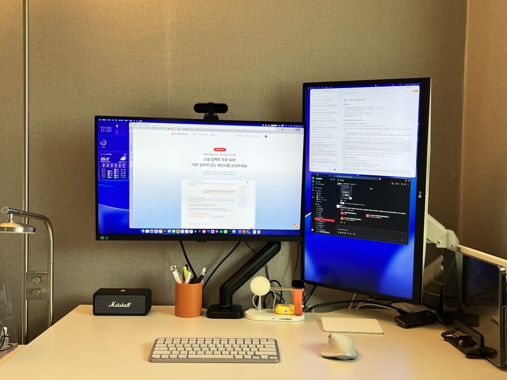 제 책상 풍경은 의외로 심플해요. 최근엔 세로로 둔 서브 모니터에 ‘클로드 코드’ 앱을 항상 띄워두고 작업하는데, 업무 흐름을 끊지 않고 AI와 바로바로 협업할 수 있어서 아주 만족하며 사용하고 있어요.