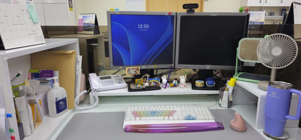 병원에서 근무하면서 손 위생에 조금 더 민감해졌습니다. 그러다 보니 자연스럽게 핸드크림을 자주 사용하게 되었고, 지금은 다양한 종류의 핸드크림을 모아두고 그날의 기분에 따라 골라 바르는 작은 루틴이 생겼습니다. 그리고 아기자기한 소품을 좋아해서 선물 받은 성물들과 귀여운 캐릭터 소품들을 책상 위에 하나씩 모아두고 있습니다. 그리고 언제든 열을 식혀줄 선풍기가 365일 함께하고 있습니다.