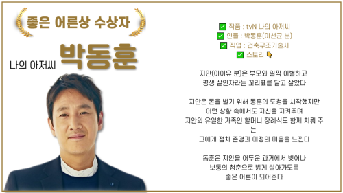 아름다운재단은 지난달 14일부터 25일까지 자립준비청년 당사자들을 포함한 일반 대중 645명을 대상으로 ‘자립준비청년을 편견 없이 다룬 미디어 속 캐릭터 및 작품과 장면’이라는 주제의 온라인 설문을 진행해 이같은 결과를 얻었다. 이 외에도 자립준비청년을 편견 없이 다룬 작품으로는 tvN 드라마 ‘우리들의 블루스’, 자립준비청년에게 좋은 어른이 되어준 캐릭터로는 tvN드라마 ‘나의 아저씨’의 박동훈(이선균 분)이라는 답변이 많았다.