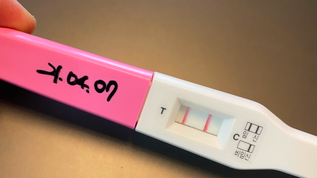 임신 테스트기에 선명한 두 줄이 나타났다.
